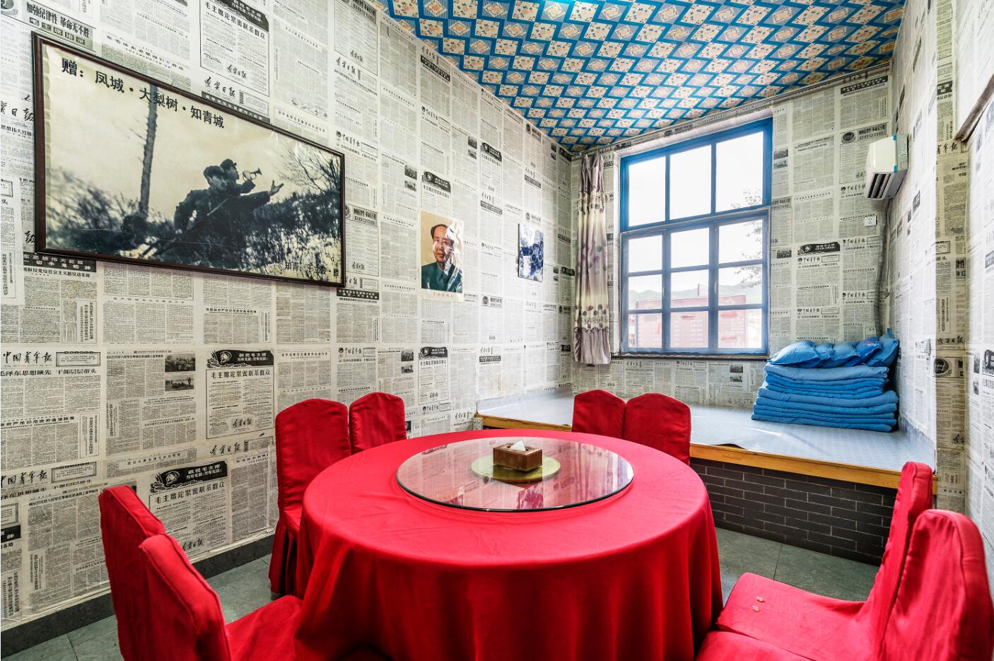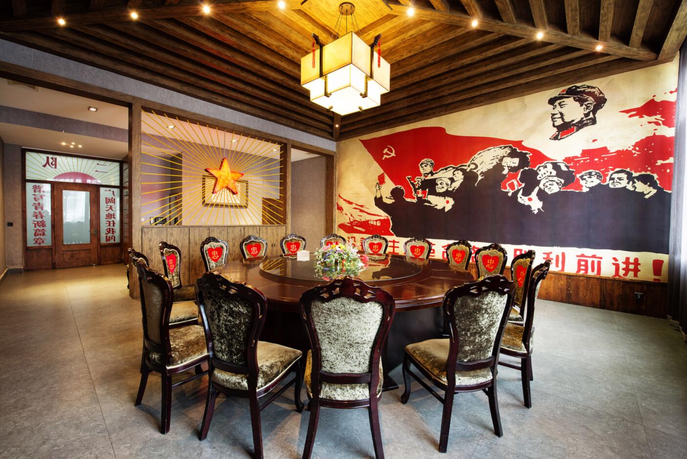 親愛的游客朋友,這里就是青年點主題飯店,以再現(xiàn)知青文化為主題。舊報紙糊的墻,知青下鄉(xiāng)時的黑白照片,毛主席像章、票證,以及用學(xué)軍、衛(wèi)東等關(guān)鍵詞命名的各個包間,會讓您重溫當(dāng)年的知青歲月。另外,周末中午知青藝術(shù)團奉獻的忠字舞、槍桿詩等精彩文藝節(jié)目,備受廣大游客喜愛。