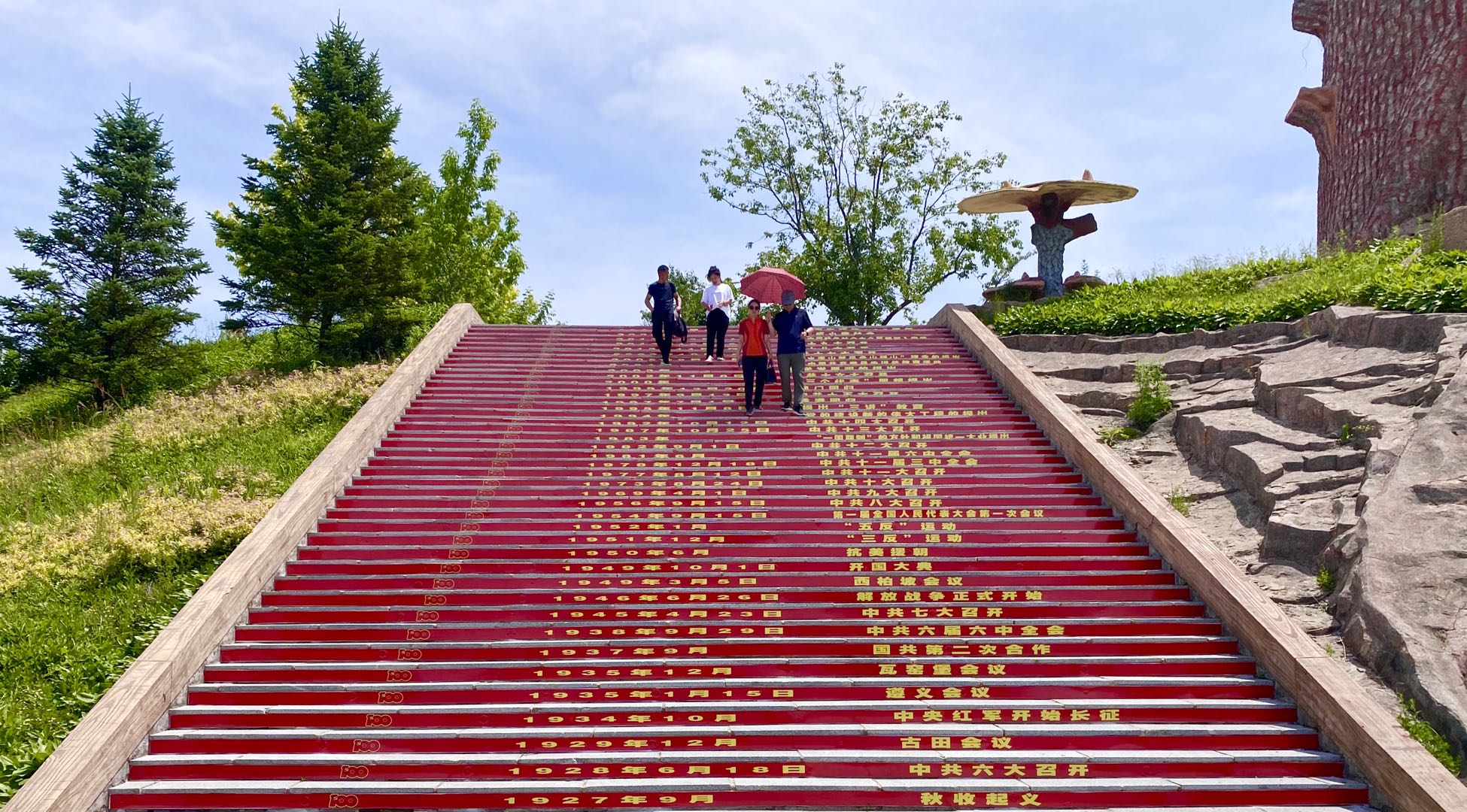 花果山廣場(chǎng)上有一棵高大的梨樹(shù),整體樹(shù)高19.9米,其中樹(shù)干高9.9米,梨高6.6米,它是花果山的標(biāo)志性建筑。游人來(lái)到這里可以進(jìn)一步了解大梨樹(shù)地名的由來(lái),同時(shí)也豐富了景區(qū)的文化內(nèi)涵。拾級(jí)而上,會(huì)看到一個(gè)小型的雕塑,一個(gè)人揮舞鐵鎬,站在刻著紅色干字的地球上,辛勤地勞作,象征著我們大梨樹(shù)人在改造生活的這片土地。